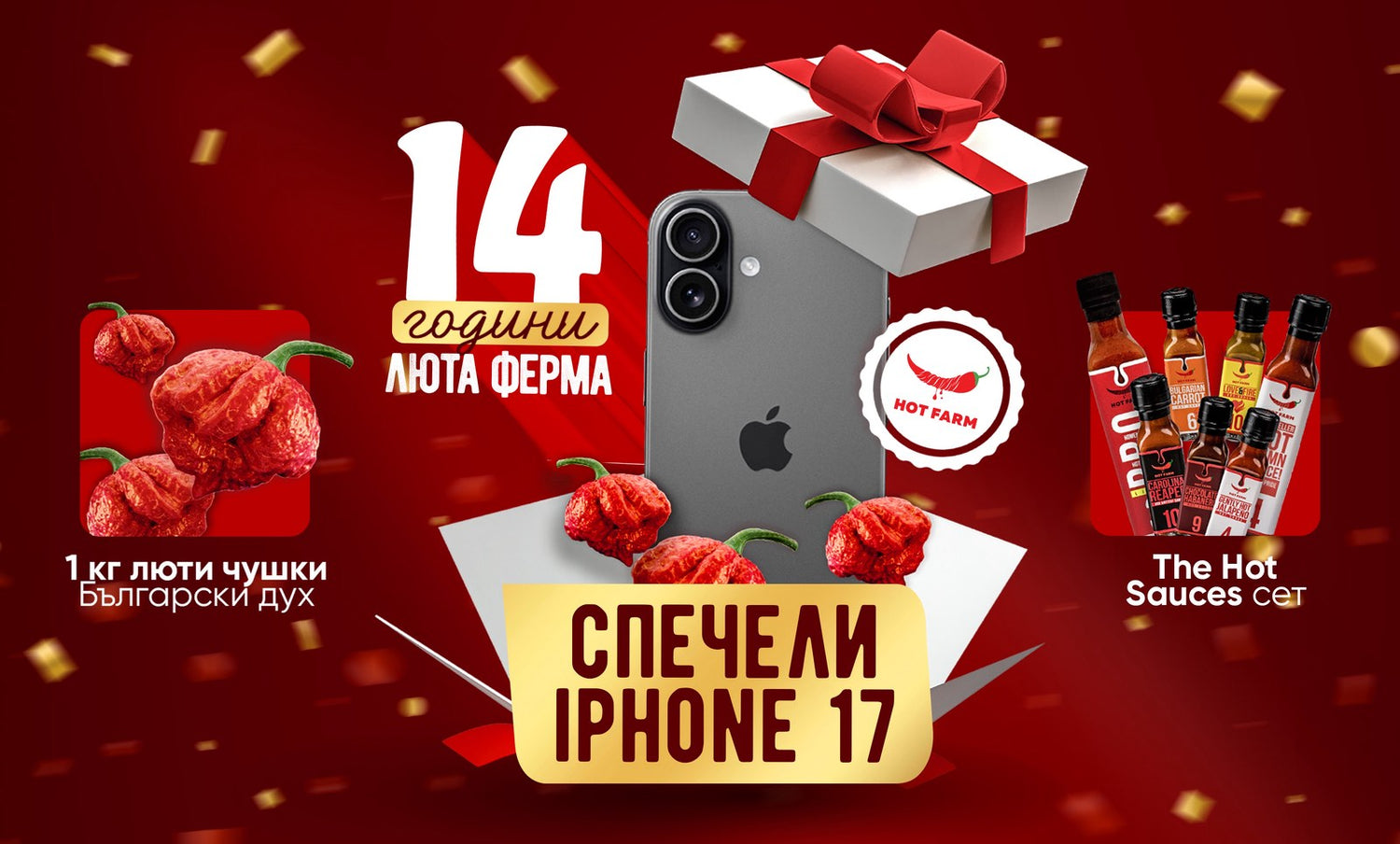По този повод даваме възможност на един от нашите фенове да грабне голямата награда - чисто нов iPhone 17. За следващите двама изтеглени в томболата също имаме награди: най-продавания ни лют сет You Are The Hottest и 1 кг люти чушки Български дух.